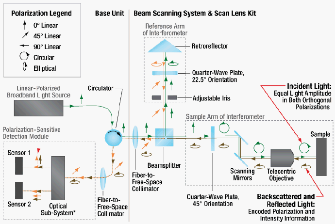 The Polarized OCT Imaging System uses an incident beam of known polarization and a dual-detector design to incorporate polarization information in 2D cross-sectional and 3D volumetric images of a sample.