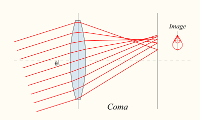 Coma occurs when an object off the optical axis of the lens is imaged, where rays pass through the lens at an angle to the axis θ. Rays which pass through the centre of the lens of focal length f are focused at a point with distance f tan θ from the axis. Rays passing through the outer margins of the lens are focused at different points, either further from the axis (positive coma) or closer to the axis (negative coma). In general, a bundle of parallel rays passing through the lens at a fixed distance from the center of the lens are focused to a ring-shaped image in the focal plane, known as a comatic circle. The sum of all these circles results in a V-shaped or comet-like flare. As with spherical aberration, coma can be minimized (and in some cases eliminated) by choosing the curvature of the two lens surfaces to match the application. Lenses in which both spherical aberration and coma are minimized are called best form lenses.