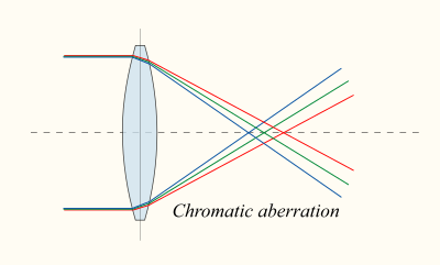 Chromatic aberration is caused by the dispersion of the lens material—the variation of its refractive index, n, with the wavelength of light. Since, from the formulae, f is dependent upon n, it follows that different wavelengths of light will be focused to different positions. Chromatic aberration of a lens is seen as fringes of color around the image. It can be minimized by using an achromatic doublet (or achromat) in which two materials with differing dispersion are bonded together to form a single lens. This reduces the amount of chromatic aberration over a certain range of wavelengths, though it does not produce perfect correction. The use of achromats was an important step in the development of the optical microscope. An apochromat is a lens or lens system which has even better correction of chromatic aberration, combined with improved correction of spherical aberration. Apochromats are much more expensive than achromats.